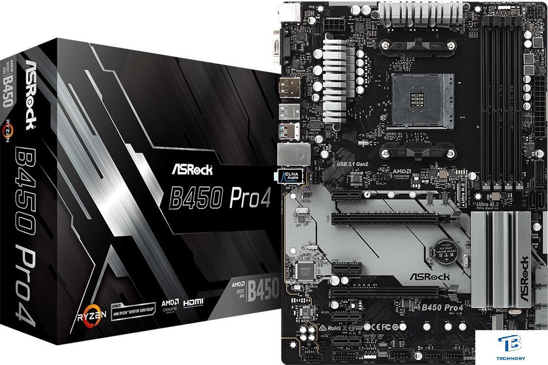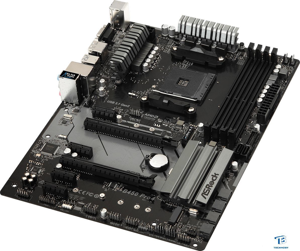 ATX, сокет AMD AM4, чипсет AMD B450, память 4xDDR4 до 3200 МГц, слоты: 2xPCIe x16, 4xPCIe x1, 2xM.2
