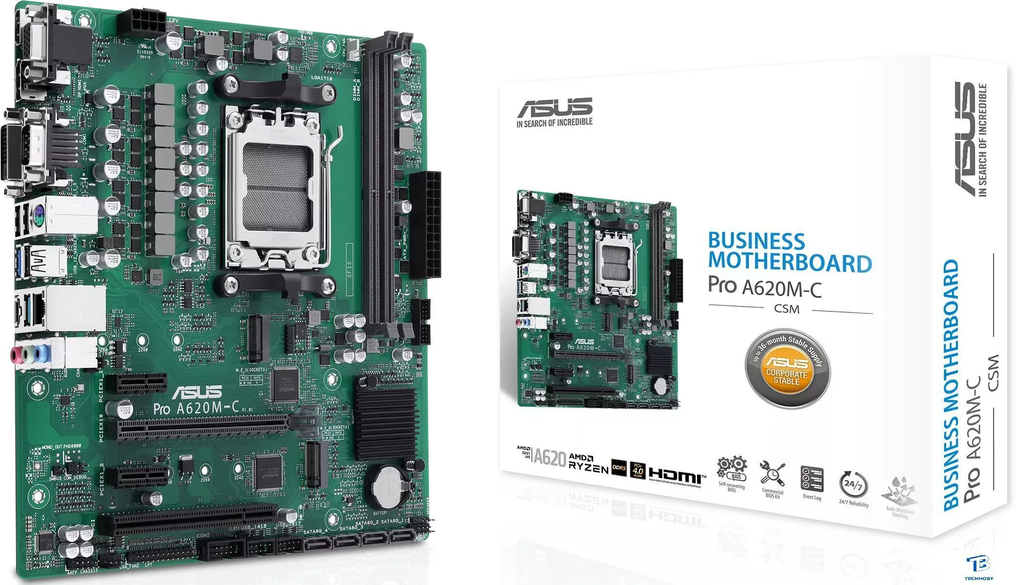 mATX, сокет AMD AM5, чипсет AMD A620, память 2xDDR5 до 8000 МГц, слоты: 1xPCIe x16, 2xPCIe x1, 1xPCI, 2xM.2