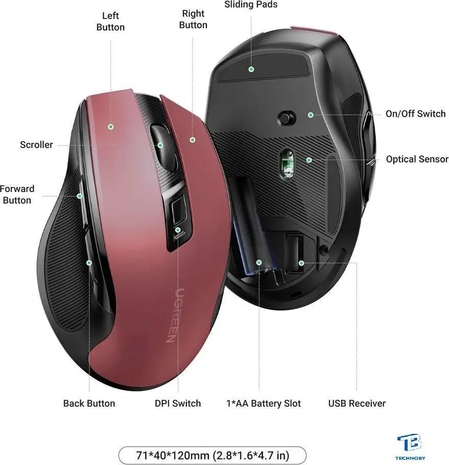 полноразмерная мышь для ПК, беспроводная радио/Bluetooth, сенсор оптический 4000 dpi, 6 кнопок, колесо с нажатием, цвет красный