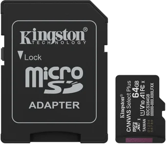 64 ГБ, класс 10, UHS-I (класс U1), V10, A1, чтение: 100 МБ/с, адаптер