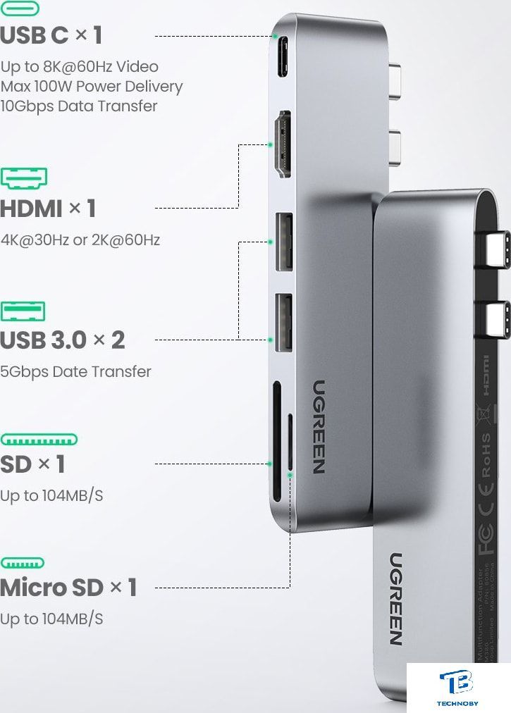 USB Type-A 3.2 Gen1 (5 Гбит/с)/USB Type-C/HDMI, 3 порта, OTG, пассивное питание, картридер SD/SDHC/SDXC/microSD/microSDHC/microSDXC, цвет серый