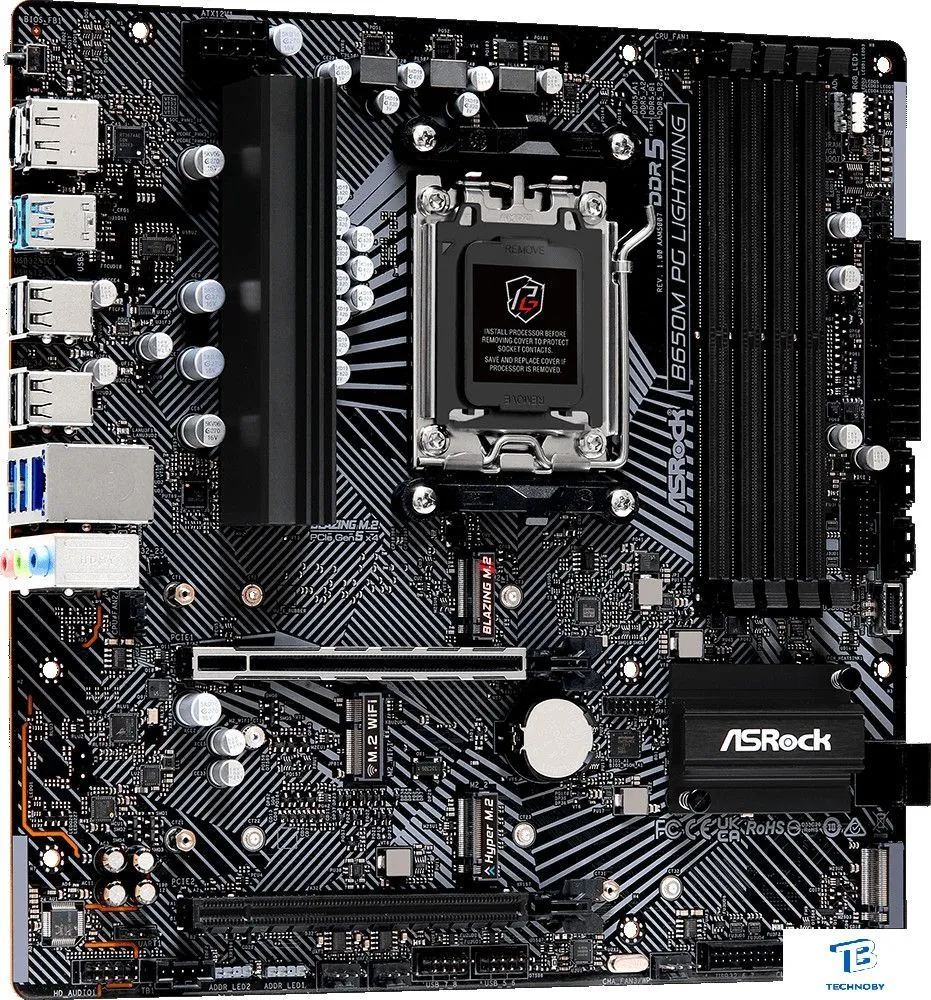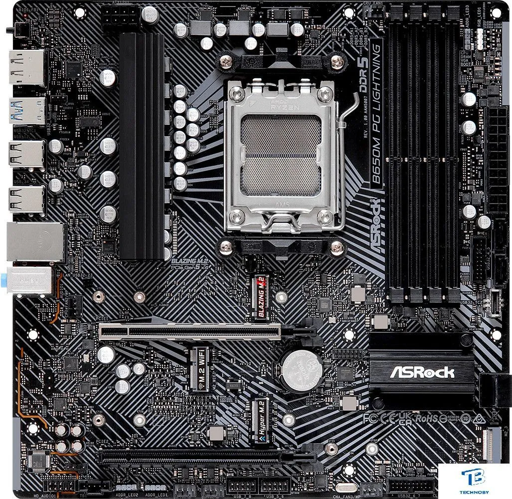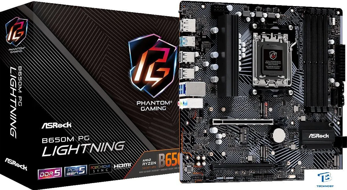 mATX, сокет AMD AM5, чипсет AMD B650, память 4xDDR5 до 7200 МГц, слоты: 2xPCIe x16, 3xM.2, 6+2+1 фаз питания