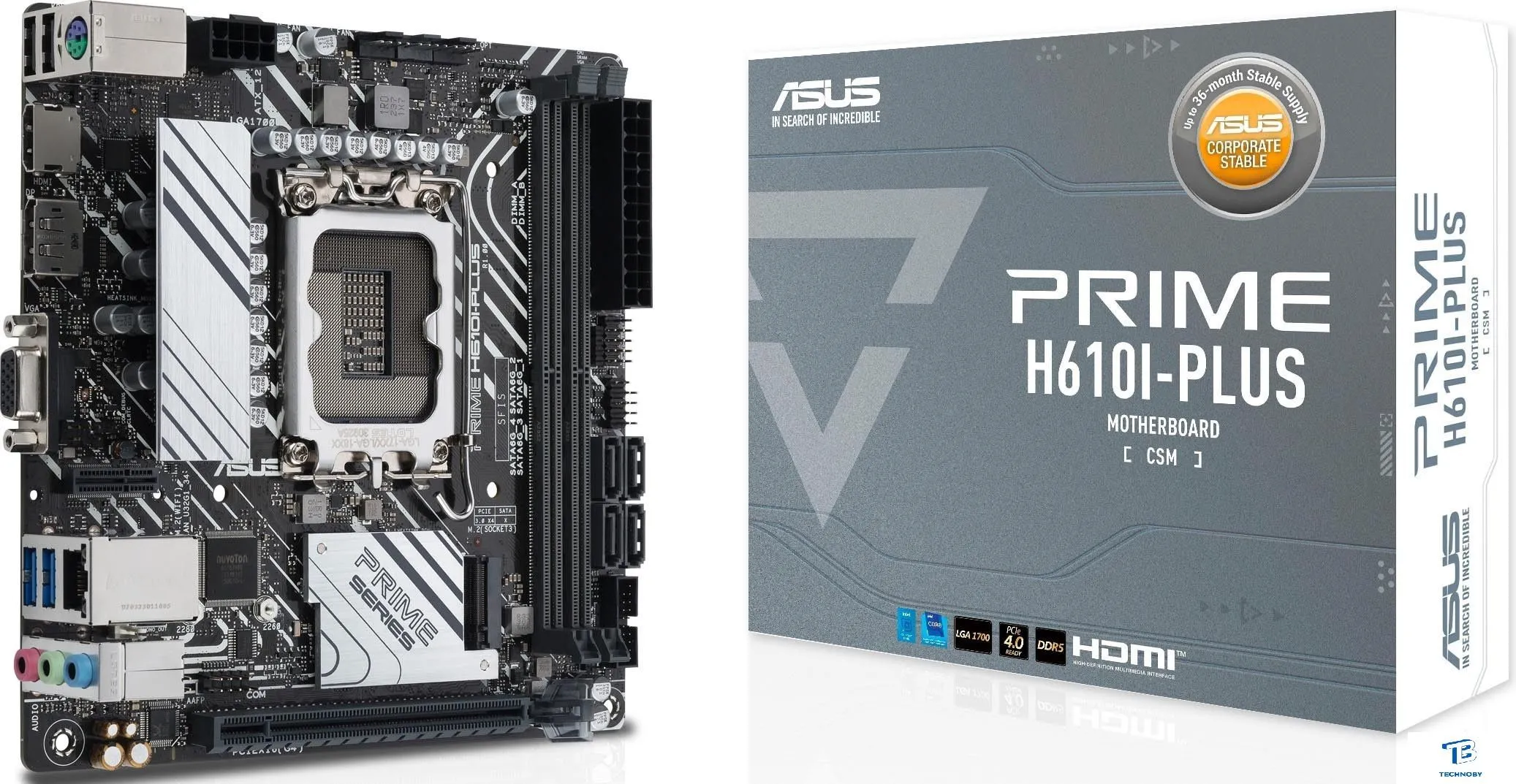 Mini-ITX, сокет Intel LGA1700, чипсет Intel H610, память 2xDDR5 до 5600 МГц, слоты: 1xPCIe x16 4.0, 1xM.2, 5+1+1 фаз питания