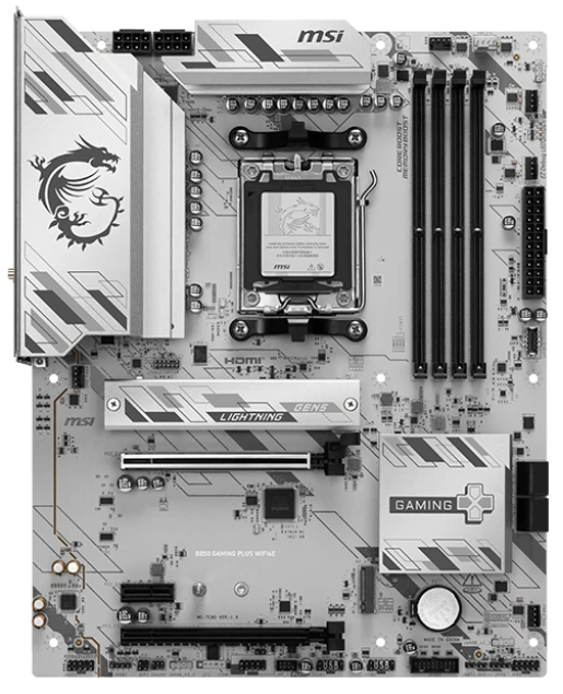 чипсет AMD B850, память 4xDDR5/DDR5 UDIMM до 8200 МГц, слоты: 2xPCIe x16 5.0, 1xPCIe x1, 2xM.2, 802.11ax (Wi-Fi 6E)+Bluetooth 5.3, 10+2+1 фаз питания, DP, HDMI