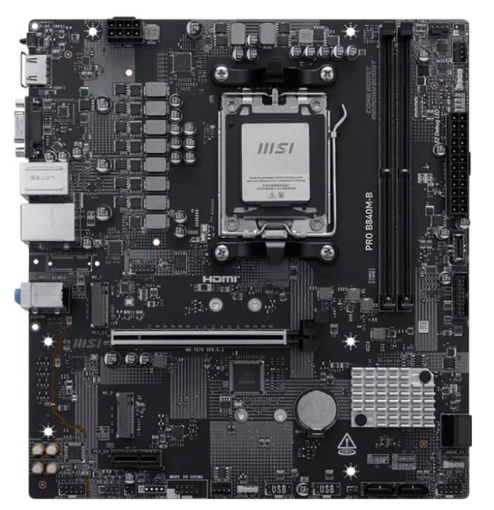 mATX, чипсет AMD B840, память 2xDDR5/DDR5 CUDIMM до 8000 МГц, слоты: 1xPCIe x16 4.0, 1xPCIe x1, 2xM.2, 7+2+1 фаз питания